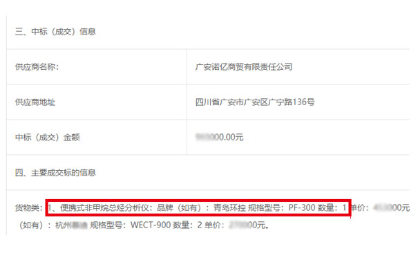 主要成交标的信息货物类:1、便携式非甲烷总烃分析仪:品牌:青岛环控 规格型号:PF-300 数量:1 。