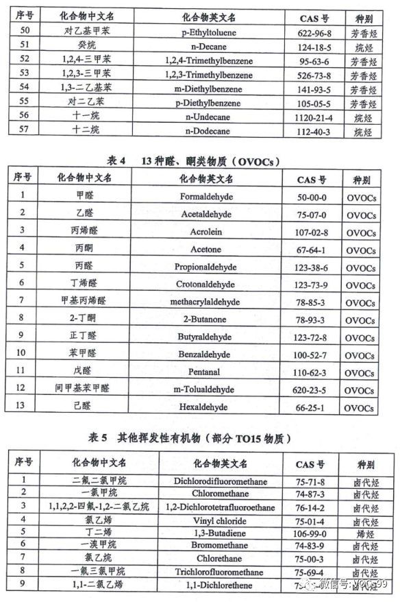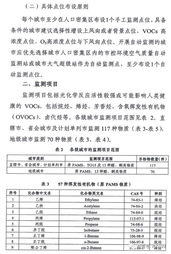 监测项目包括光化学反应活性较强或可能影响人类健康的VOCs,包括烷烃、烯烃、芳香烃、含氧挥发性有机物(OVOCS)、卤代烃等。各级城市监测项目范围见表2。直辖市、省会城市及计划单列市监测117种物质(表3-表5),地级城市监测70种物质(表3、表4)。